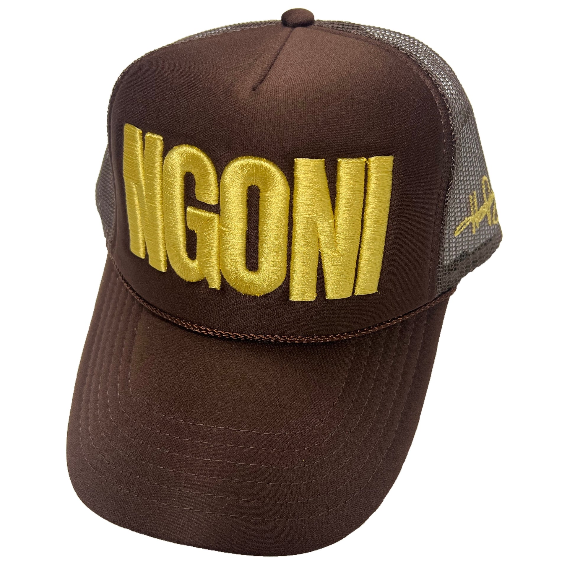 This is a Ngoni | 2025 release foam trucker hat. Color is Mocha Brown (Gold/Ngoni)