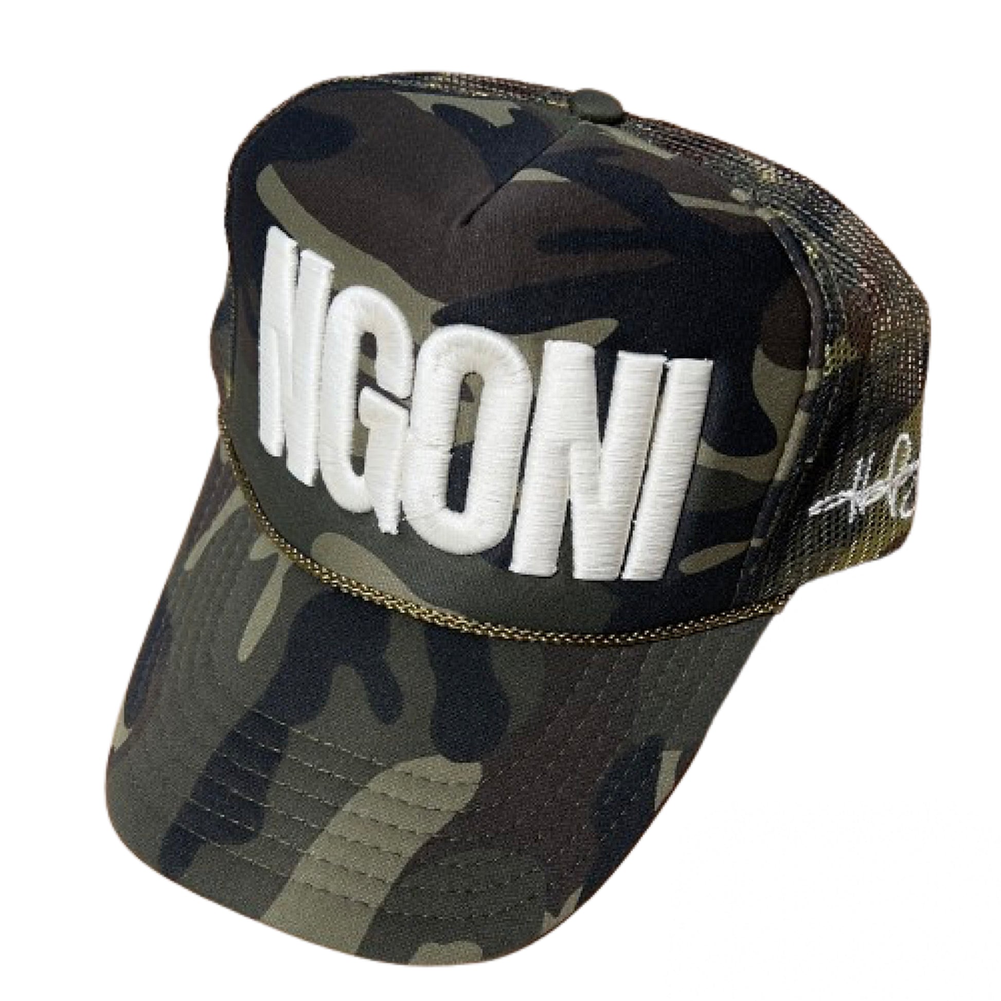 This is a Ngoni | 2025 release "Month of May" Foam Trucker Hat. Color is Camo Green (Off White/Ngoni)